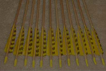 "I just received my arrows a few moments ago; I must tell you IMMEDIATELY how pleased I am with them. Dan did a wonderful job splicing the cock feathers, and even replicated my vision of a crest scheme -- without a fax. These arrows are wonderfully beautiful." ~ Guy