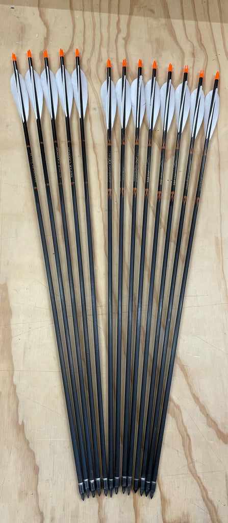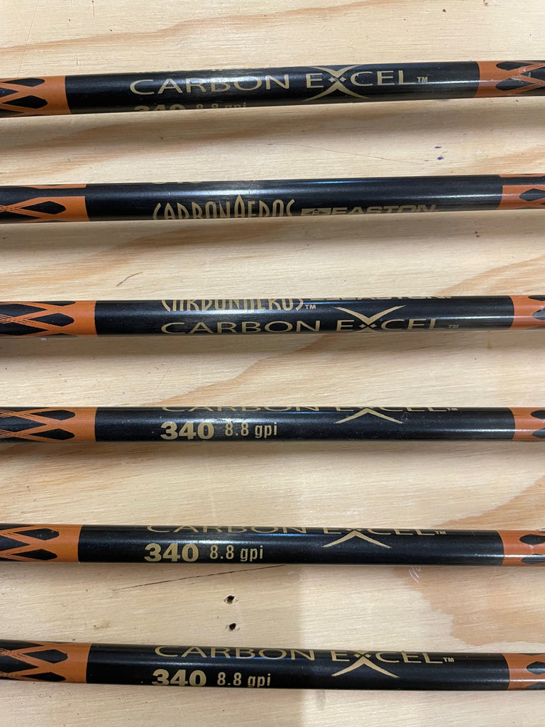 A group of 13 of the Easton Carbonaeros Excel 340. The fletching is brand new. 8 of them are 29 1/2" back of point and the other 5 are 30 1/2"