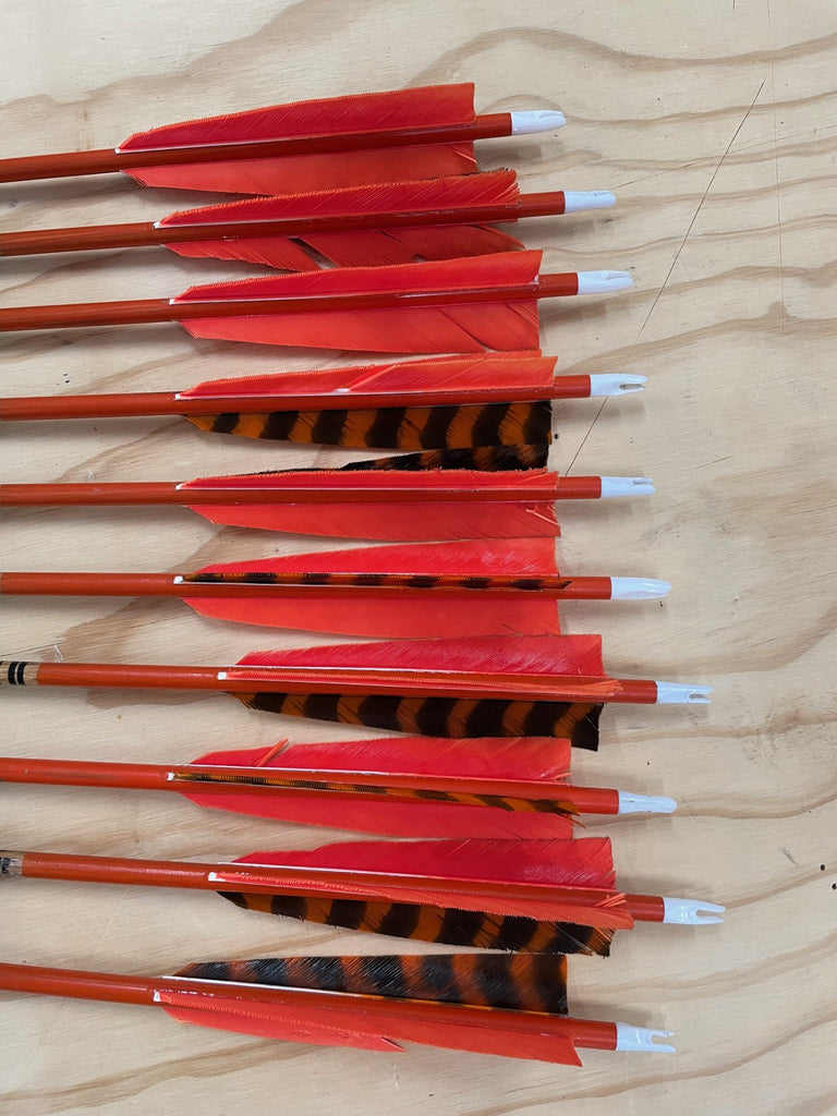 A set of 10 Gold Tip Traditional 400 arrows. They are different lengths with two at 28 1/2 back of point, 3 at 28 1/4 back of point, 4 at 28" back of point an one at 27 1/2" back of point. All in good used condition. One of the arrows has a torn feather, see in photo on the far right.