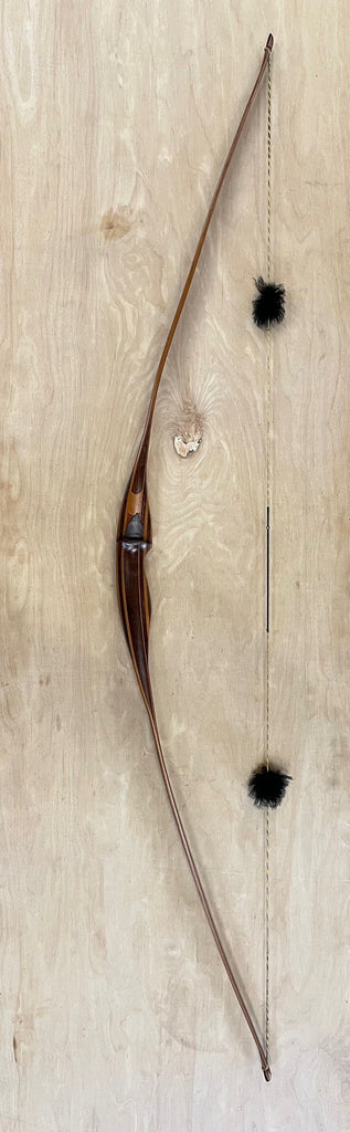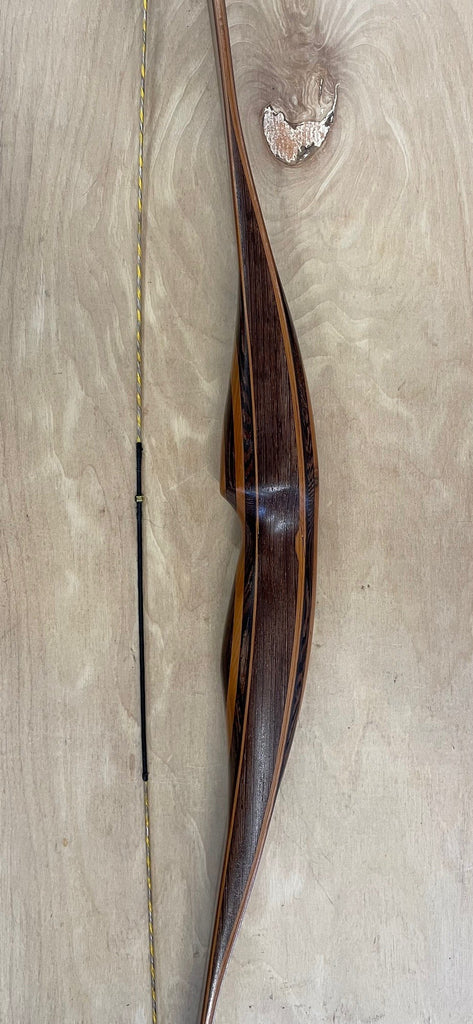 A right hand 62" Raptor Signature Longbow, that pulls 43#@28". Brought in by a customer to trade in for another bow. Its in excellent condition Bow is made with Pacific Yew under clear glass . Riser is Pacific Yew and contrasting Wenge that has lots of figure to set off the Yew. Blood wood center beam, Wenge and Yew tips and overlays to accent.