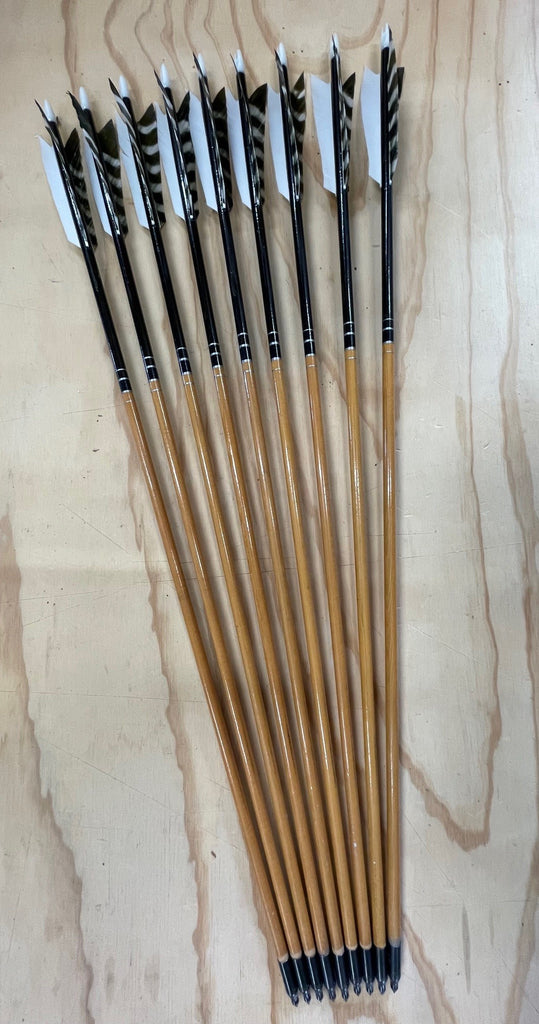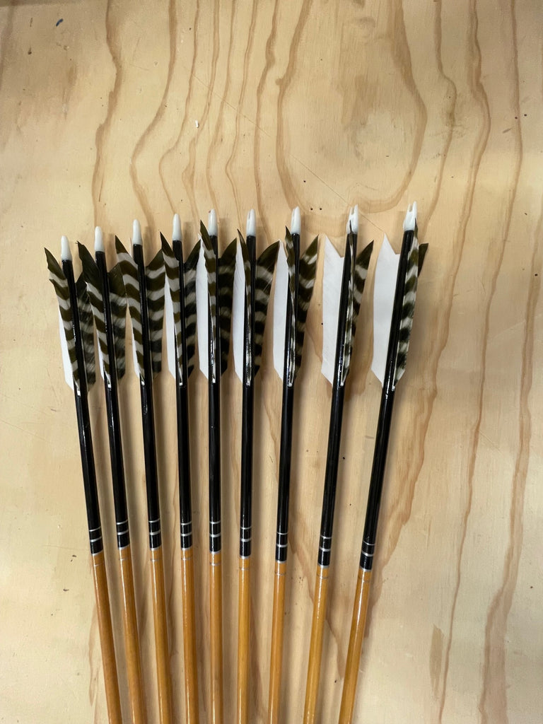 A set of 9 used Raptor tapered Eagle arrows that are 28" back of point and 40-45# spine made from Fir.